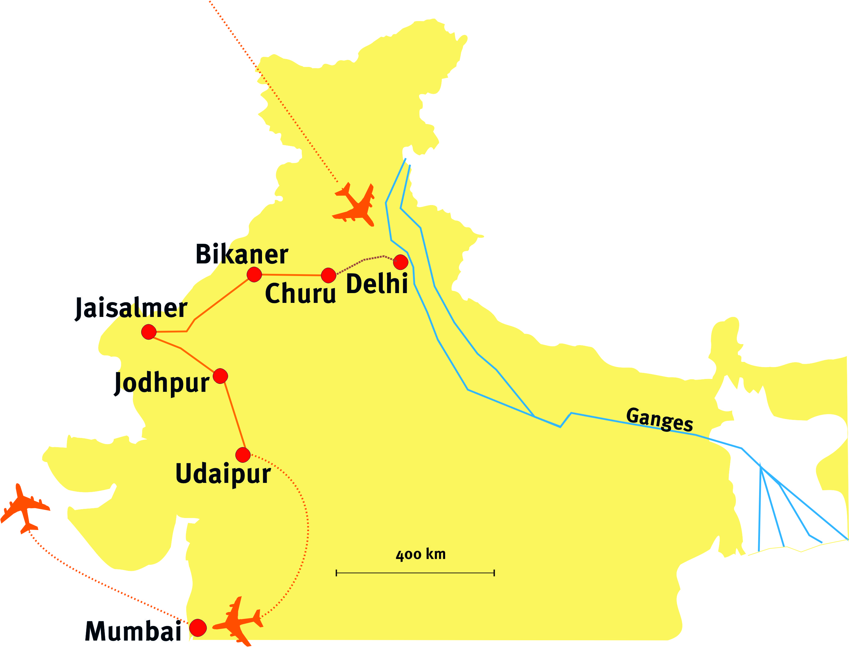 Von der quirligen Hauptstadt Delhi aus reisen Sie weiter zum Tor zur Thar-Wüste Churu, wo kunstvolle Havelis mit ihren detailreichen Fresken die Fassaden die Straßen schmücken. Die gesamte Shekhawati-Region gilt als Indiens größtes Freilichtmuseum! In Bikaner erhalten Sie einen faszinierenden Einblick in die Kamelzucht und machen einen spannenden Ausflug zum einzigartigen Karni-Mata-Tempel, wo bis zu 25.000 heilige Ratten das Heiligtum bevölkern. Weiter geht es zur goldenen Stadt Jaisalmer, deren gleichnamige Festung zu den wenigen noch bewohnten Forts der Welt zählt. Eine Kamelsafari durch die goldenen Dünen der Thar-Wüste ist ein Erlebnis, das man so schnell nicht vergisst. Jodhpur beeindruckt mit dem mächtigen Mehrangarh Fort, das 125 Meter über der charakteristischen blauen Altstadt thront. Den romantischen Abschluss in Rajasthan bildet Udaipur mit seinen Seenlandschaften, weißen Palästen und einer unvergesslichen Bootsfahrt auf dem Pichola-See bei Sonnenuntergang. Von Udaipur fliegen Sie weiter zu Ihrer letzten Station Mumbai, der pulsierenden Heimat Bollywoods. Hier erwarten Sie koloniale Prachtbauten, lebendige Märkte und Jahrtausende alte Höhlentempel.