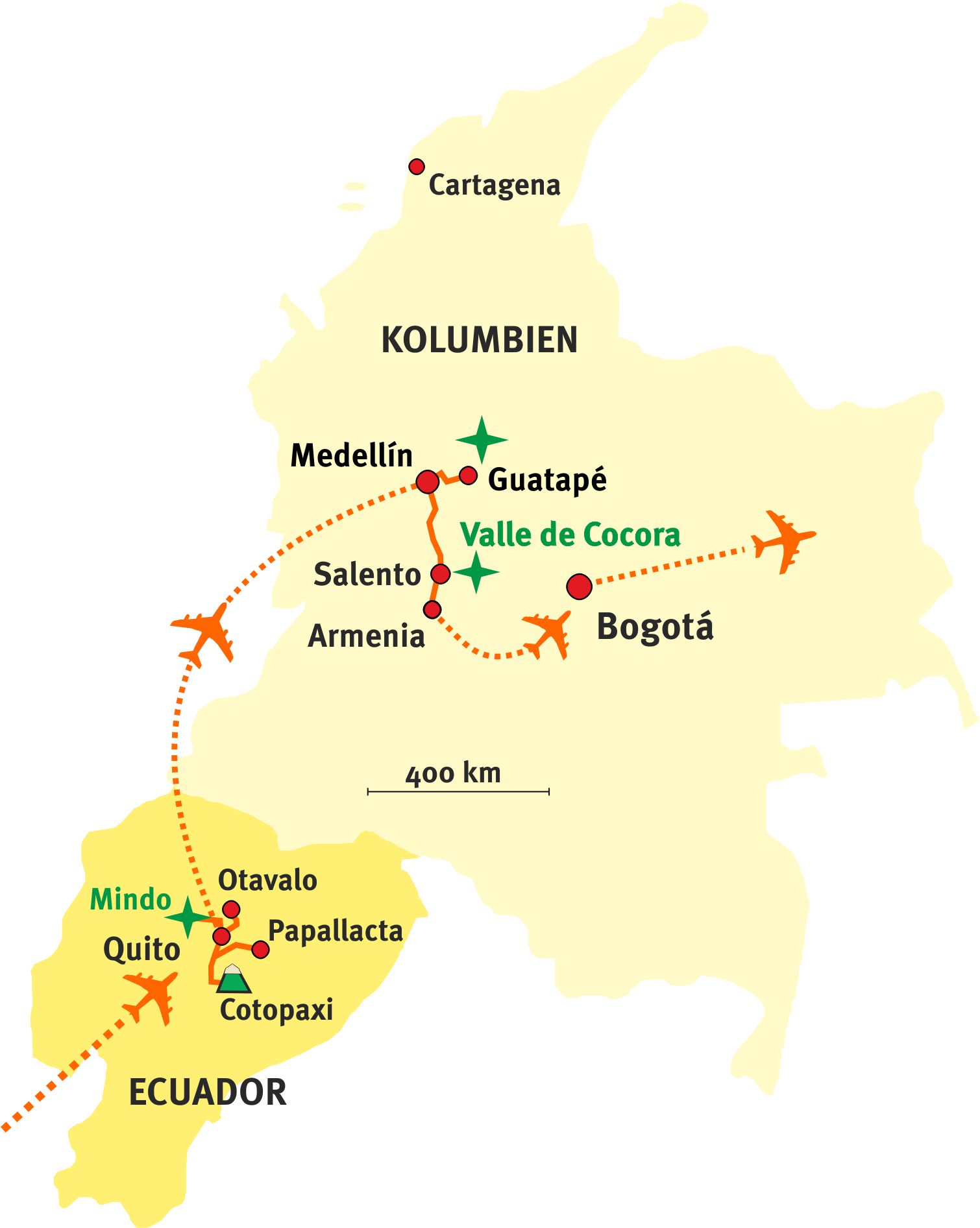 Die Direktflüge zwischen Quito und Medellín gehen nicht täglich - die Route kann entsprechend angepasst werden. Flugpreise variieren je nach Wochentage/Saison.